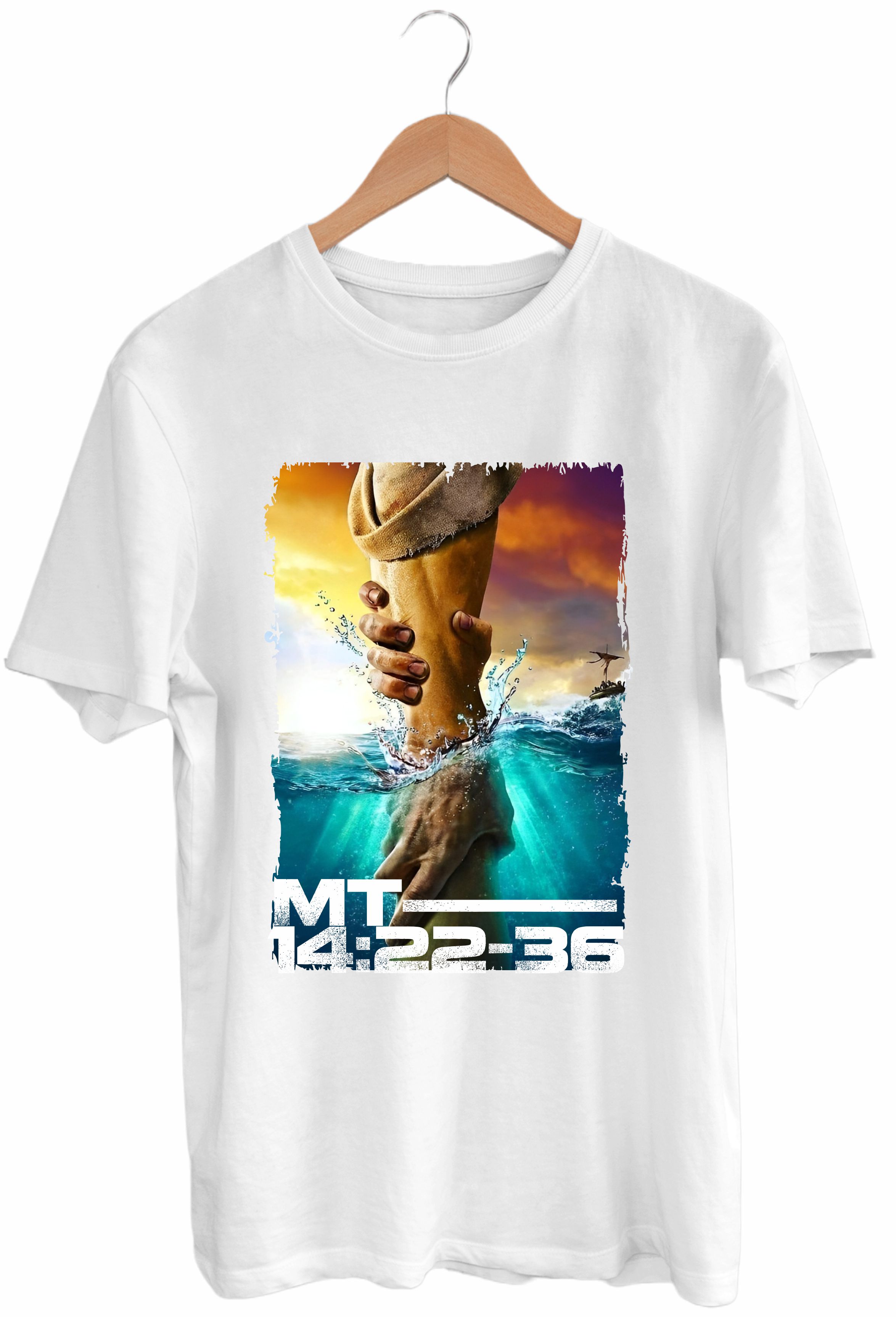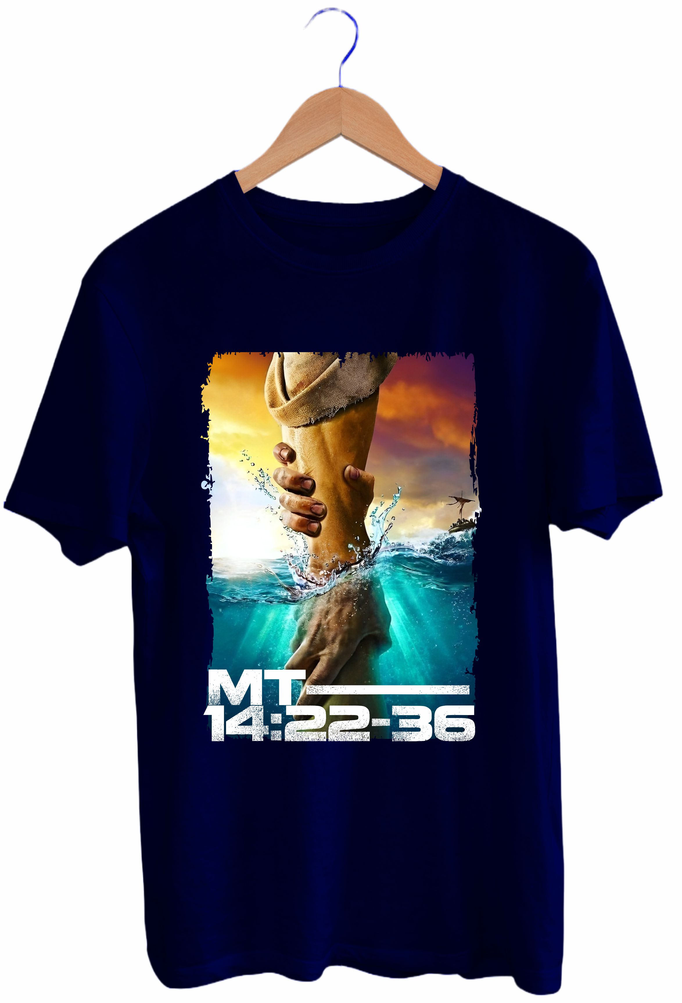 Cada detalhe da arte representa confiança, entrega e o poder de olhar para Cristo mesmo nas ondas mais fortes. Uma camiseta para quem carrega no peito a fé que sustenta, mesmo quando os pés não tocam o chão.